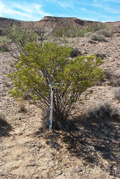 Sensor Web pod 13 in a Creosote bush (Larrea tridentata). The general desert terrain is clearly visible.