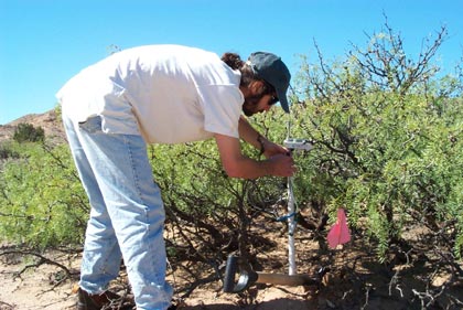 Gregory Bonito installs Sensor Web pod 9 under a Mesquite shrub (Prosopis glandulosa var. torreyana).