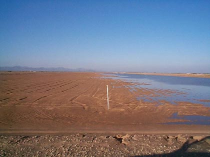 Looking west over Recharge Basin 102 during a flooding event. Note that the water is working its way from the north side of the basin towards the south (right to left in the picture). Sensor Web pod 7 is in the foreground.
