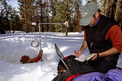 A record snowfall in the 2005 season required occasionally checking mounting poles. Here, researchers remount Sensor Web Pod 2 above the snow surface.