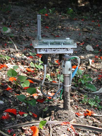 Sensor Web Pod 14 with buried temperature and soil moisture sensors clearly attached. The mud on the pod is the result of nearby watering.