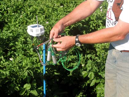 Soil temperature sensors (black) and Watermark soil moistures sensors (green) are attached to the bottom of each Sensor Web pod. There are two sets of sensors for each pod, one at a depth of 10 cm and the other at a depth of 20 cm.